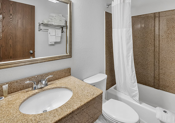 - ADA Guest Room Bathroom Has Clear Floor Space And Is Slip-Resistant